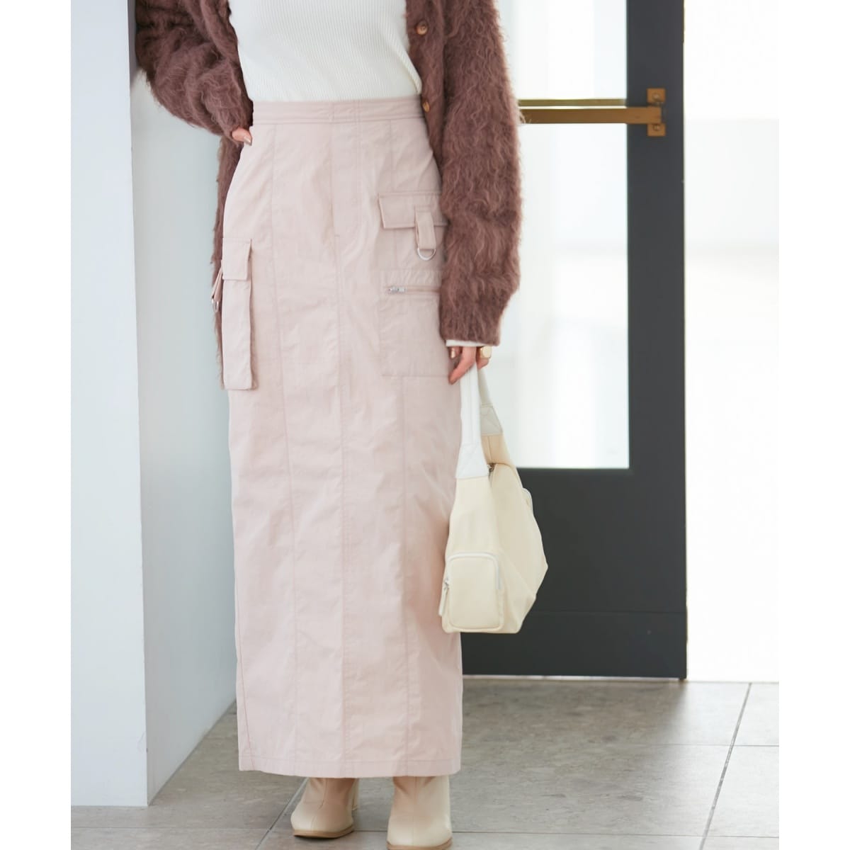 VIS「洗える」裏起毛カーゴタイトスカート ロング ホワイト S