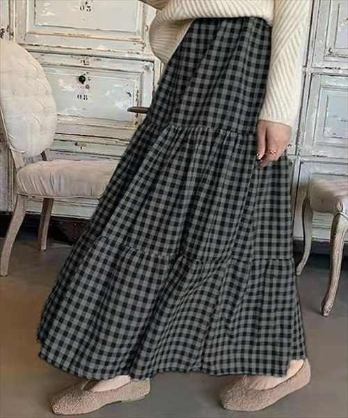 ふんわりしたギンガムチェックマーメイドティアードスカート ロング丈