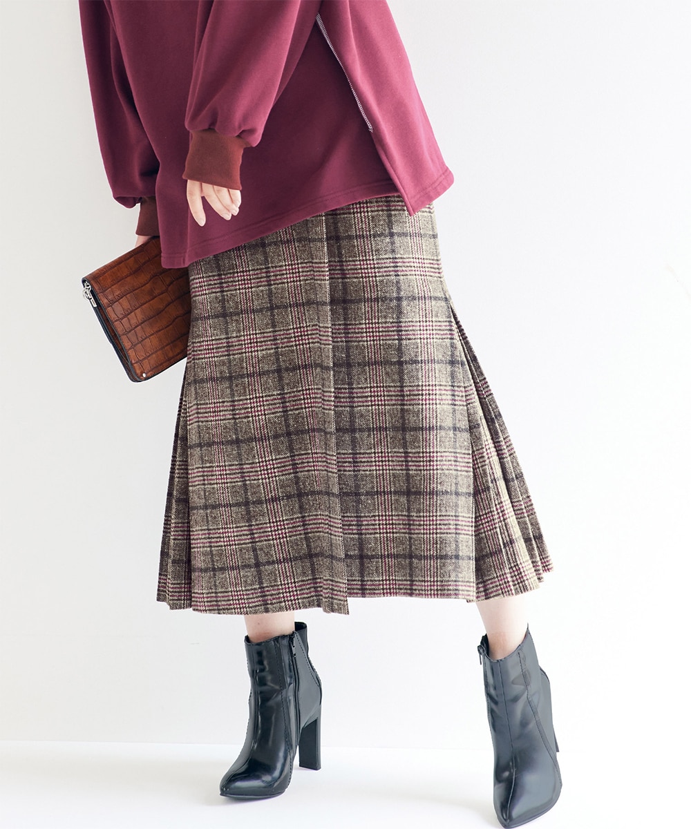 両サイドにプリーツを施したスカートは、前からだけでなく横から見ても可愛さのあるデザイン。起毛感のある生地と大人な配色のチェックが、女っぽいスタイルを演出してくれる。
