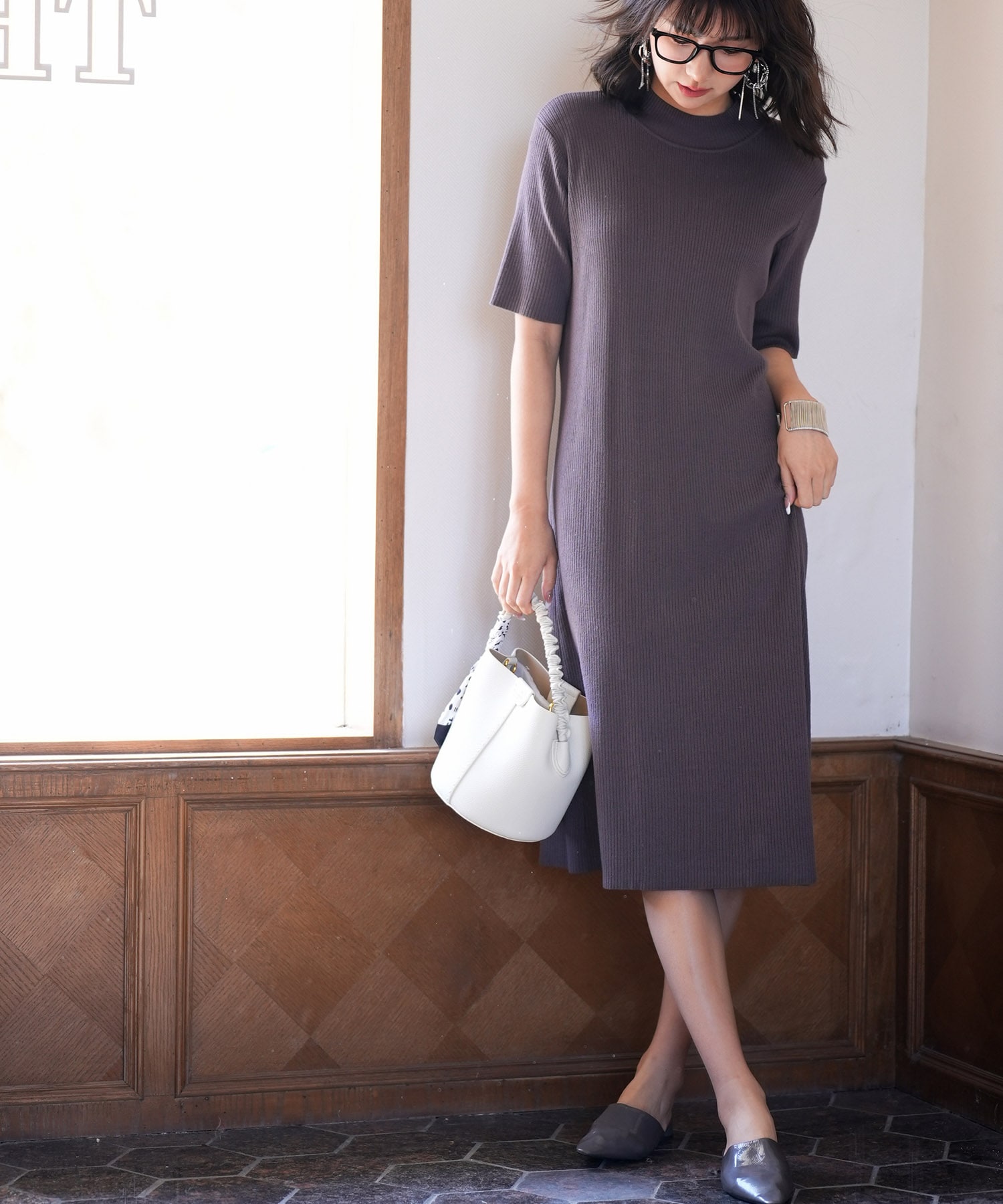 ワンピース レディース ニット ウエスト セットアップ風 クルーネック スリット入 ベルト付 ミモレ丈 ワンピース L