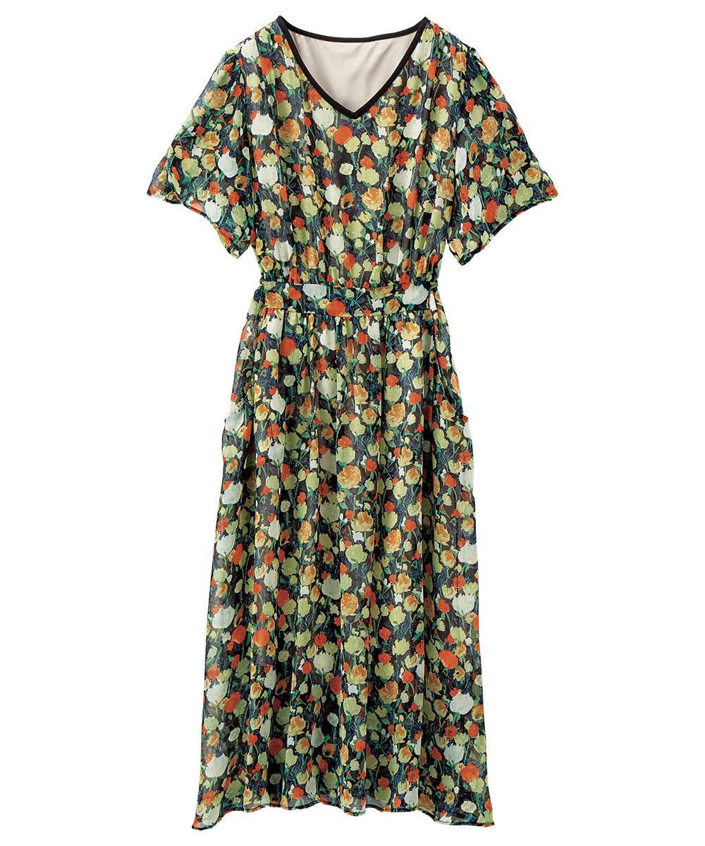 半袖ワンピース/0/ポリエステル/BLK/花柄/インナーワンピ付/シフォンワンピース