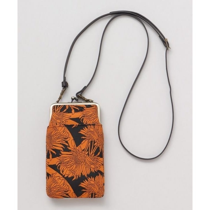 ふっくらとした織り方が特徴の「ふくれ織」で仕立てたがま口ショルダー。モードな和の花と色合いが印象的。どんな服装にも似合います。スマホがすっぽり入るサイズで、ちょっとしたお出かけにも便利です。ショルダー紐は長さ調節、取り外し可能。外ポケット1つ付き。