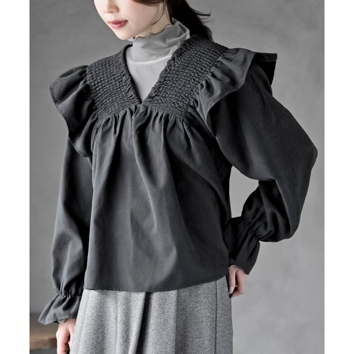 肩のフリルと胸元のシャーリングが大人ガーリーな装いを演出するブラウス。