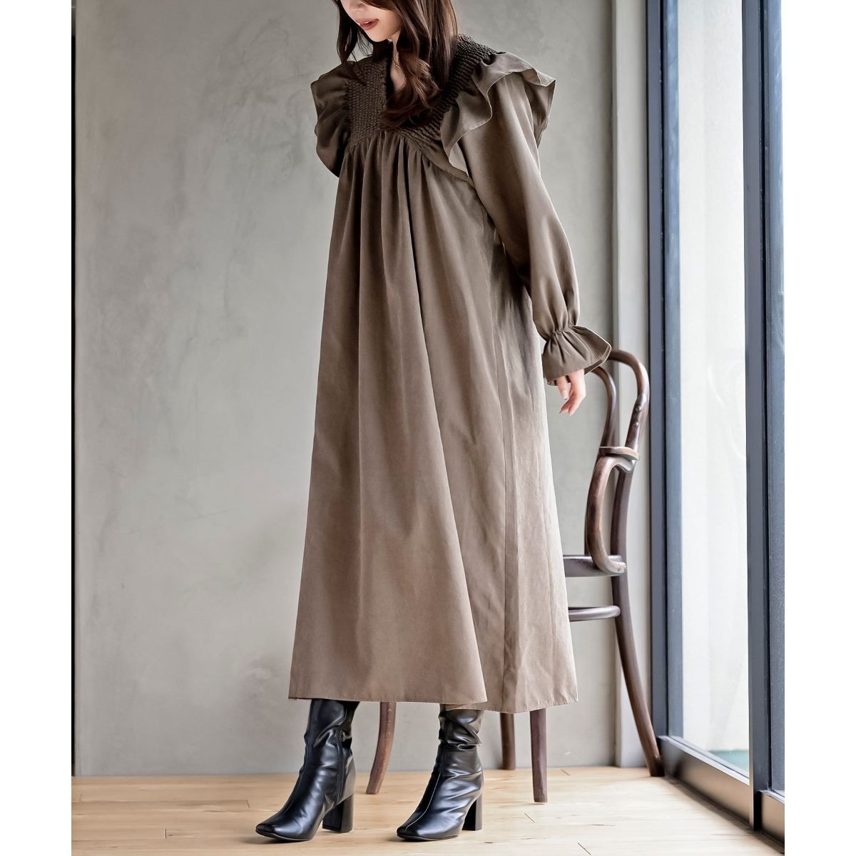 肩のフリルと胸元のシャーリングが大人ガーリーな装いを演出するワンピース