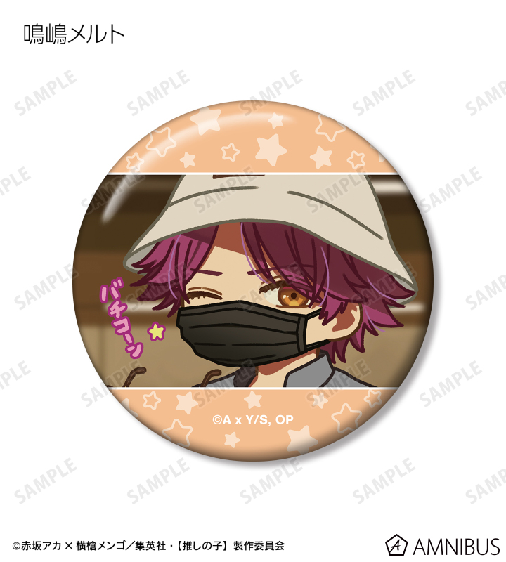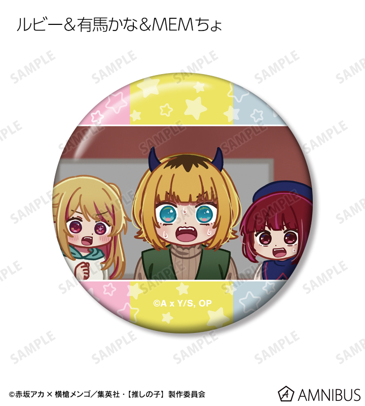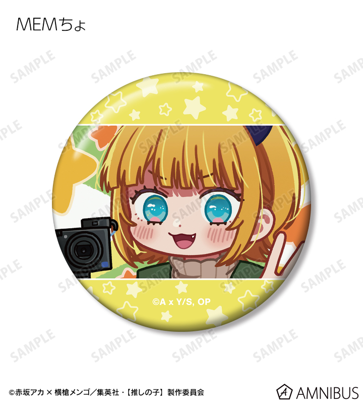 アイ、アクア、ルビー、有馬かな、黒川あかね、MEMちょ、姫川大輝、鳴嶋メルト、鴨志田朔夜の印象的なシーンのゆるコマイラストを、缶バッジに仕上げました。
