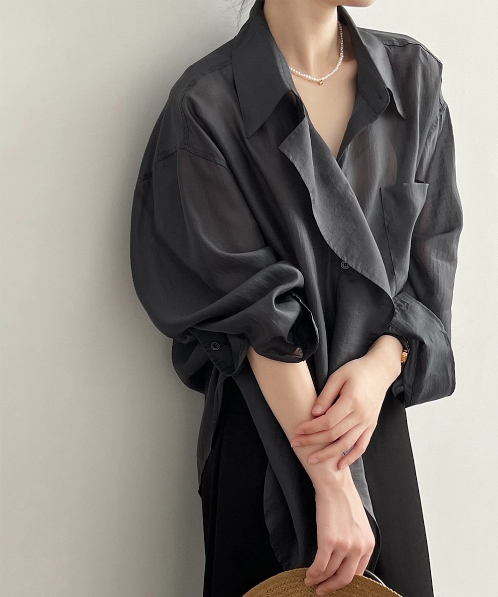 透け感だけでなく、光沢感のある生地がさらにエッジの効いたモードな雰囲気に。滑らかな肌触りが着心地のいいアイテム。シンプルなスタイリングも存在感抜群。ボディライン拾わず着られるゆとりのある身頃に、レディライクな柔らかいシアー感が魅力のアイテムです。オーバーサイズがコーデのヌケ感をプラス。カジュアルなコーデとの相性抜群。デニムやニットパンツなどのシンプルなコーデがオススメ。ワンピースに羽織るだけでもトレンド感あるコーデに。夏場外出時に紫外線防止、冷房対策にもおすすめの1枚です。