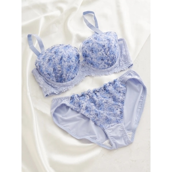 フラワープリントのデザインがフェミニンな風合いを放つブラ&ショーツのセット。