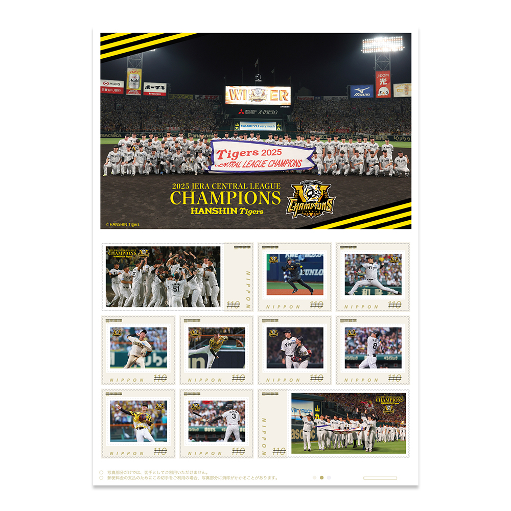 記念切手セットには、歓喜に沸く優勝決定の瞬間や、藤川監督の胴上げ、選手たちの活躍を収めた写真を厳選し、特製ホルダー・フレーム切手としてデザイン。