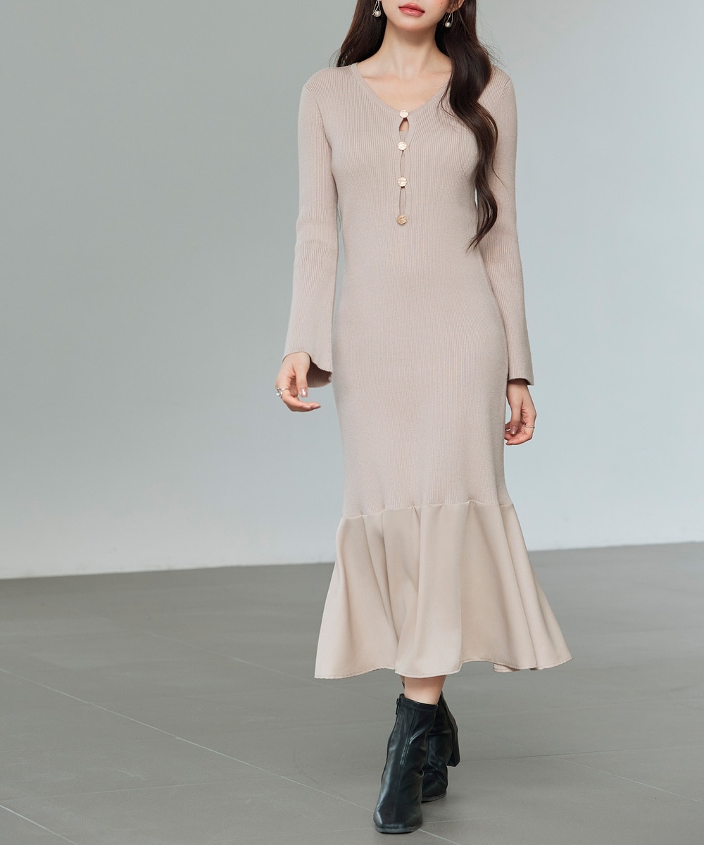 デシンドッキングが華やか見えするマーメイドニットワンピース。