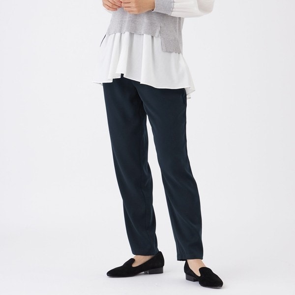 リラックス感がありつつキレイ目な見た目のイージーテーパードパンツ。生地に落ち感があるので、スッキリときれいなシルエットが形成されます。体につかず離れずの絶妙なパターンを極めた、美脚ボトムに仕上げました。
