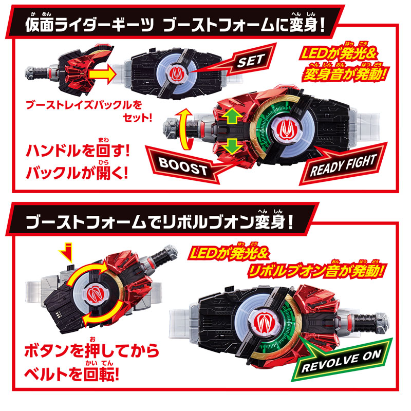 ライダーコアIDと、レイズバックルを組み合わせての変身で、仮面ライダーギーツの10フォームへの変身遊びが可能! 固有ギミック搭載のレイズバックル、ベルト回転ギミックなど遊びが満載の変身ベルト。