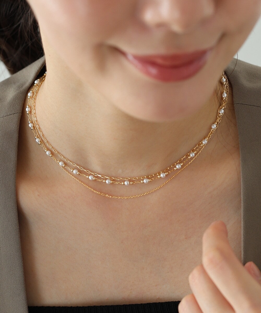 動くたびに光を反射してきらきらと輝く3種類のチェーンと華奢なパール&メタルビーズが連なった目を惹くデザイン。