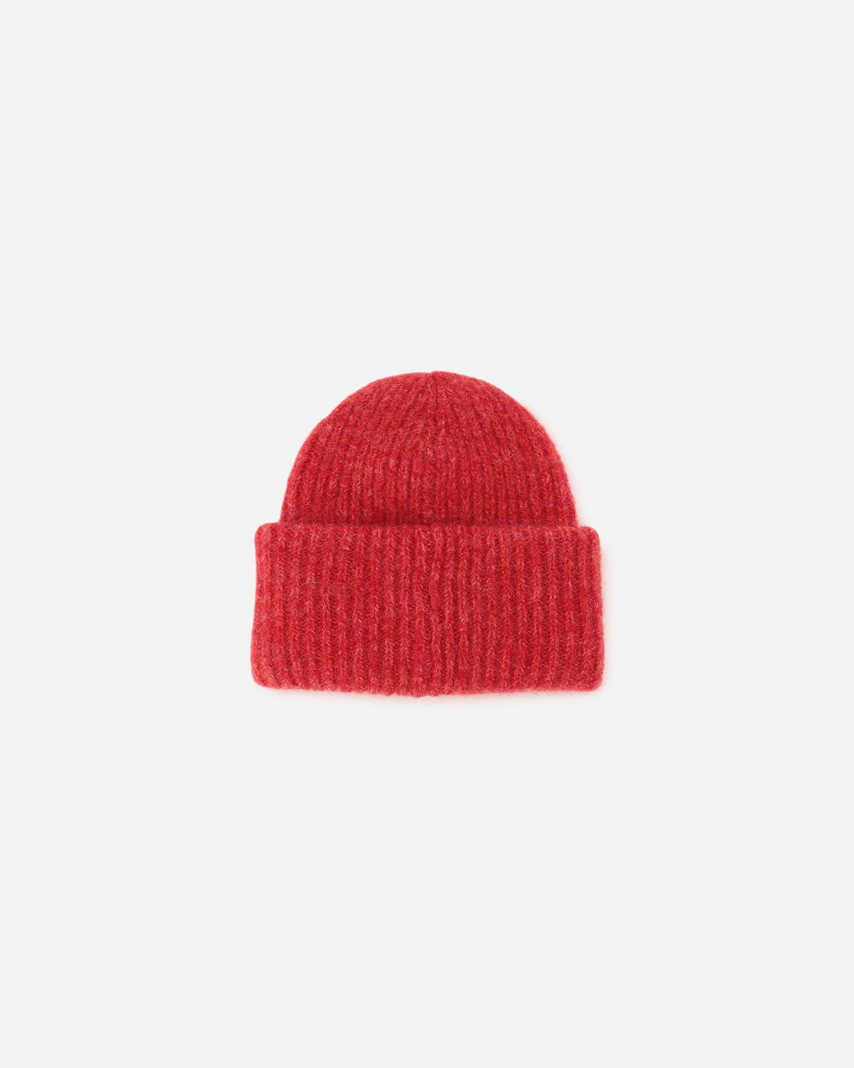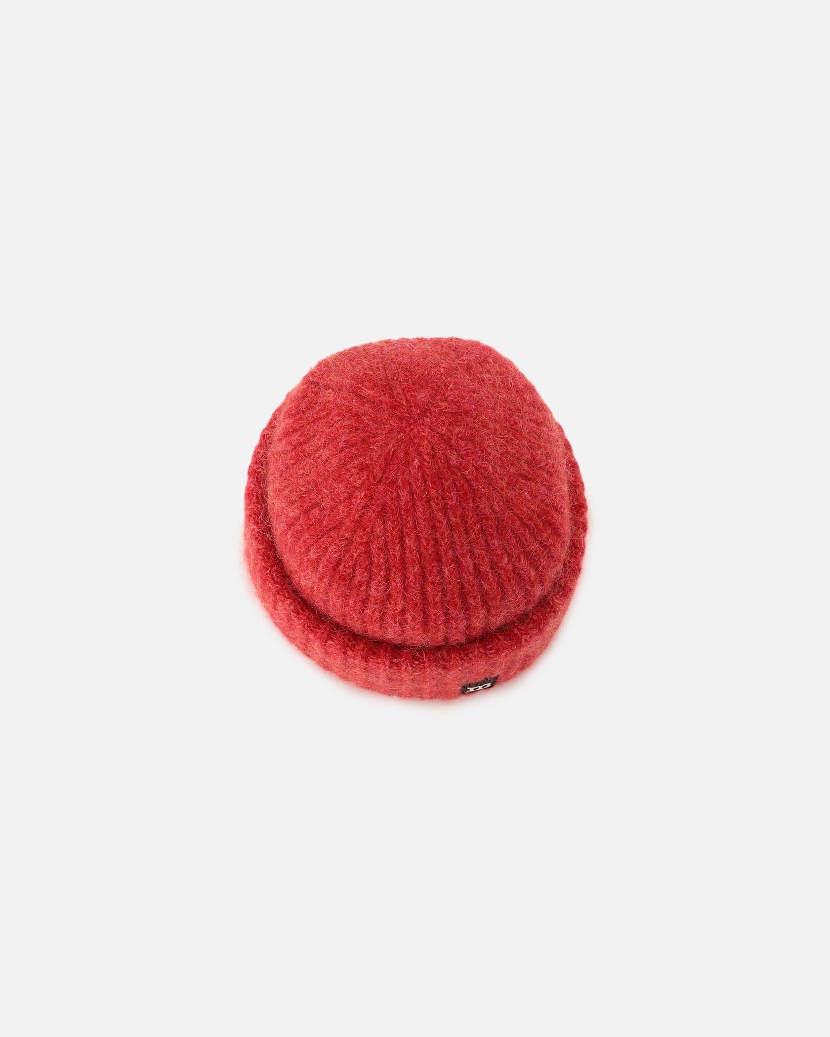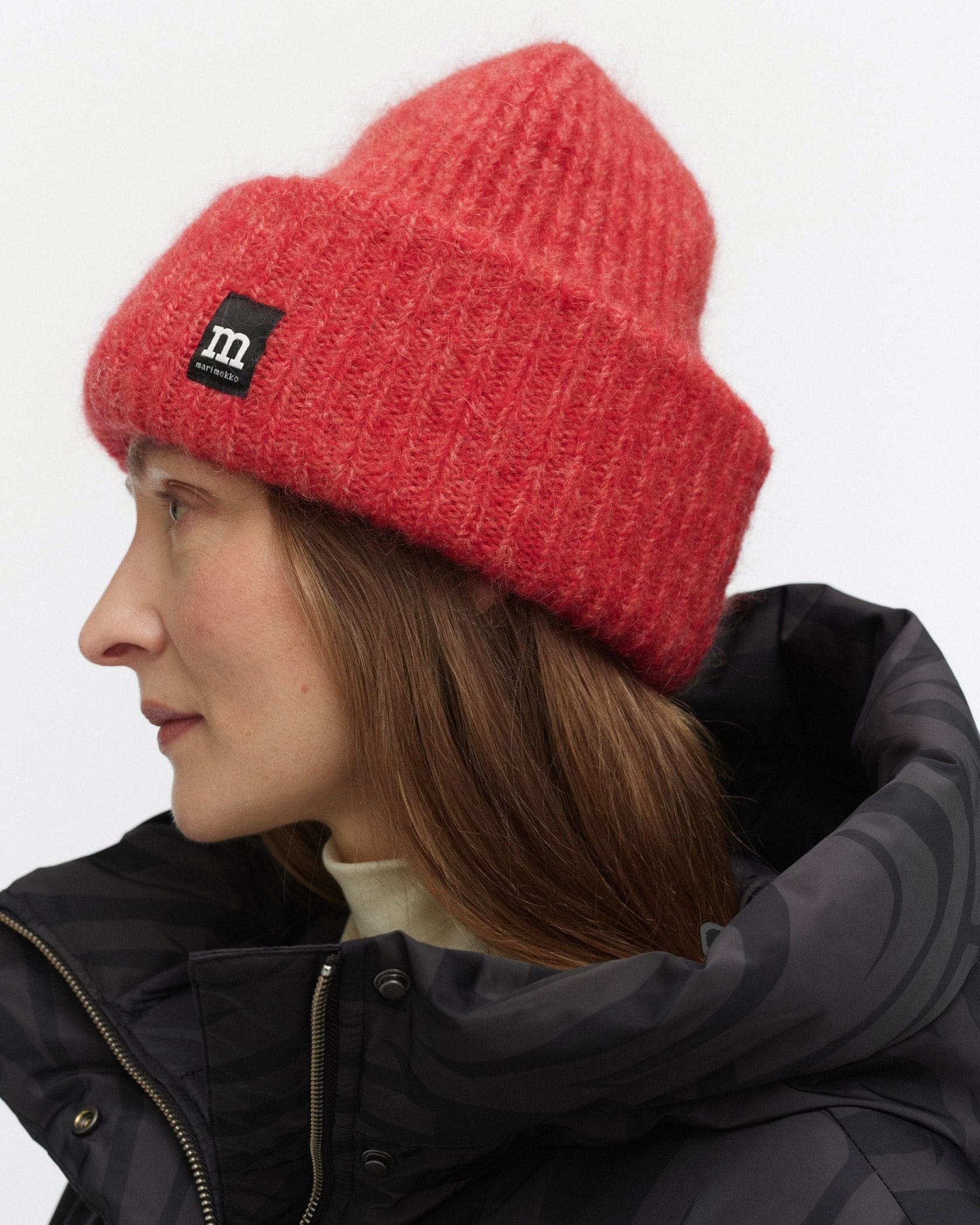 marimekkoのロゴパッチをあしらった、シンプルながらもコーディネートのポイントになるビーニー。起毛糸を使って、ローゲージの立体的なリブ編みで表情豊かに仕上げました。空気をたっぷり含んだ優しい肌ざわりで、被り心地もふんわり暖か。大きく折り返したロール部分は小顔見せにも効果的です。