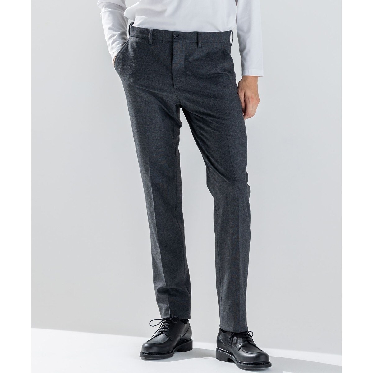上品さのある単品パンツ。スーパークリース加工により、パンツを常にきれいに保ちたい、手間を省きたい方におすすめ。ビジネスシーンで好印象を与え幅広くコーディネイトできるアイテム。