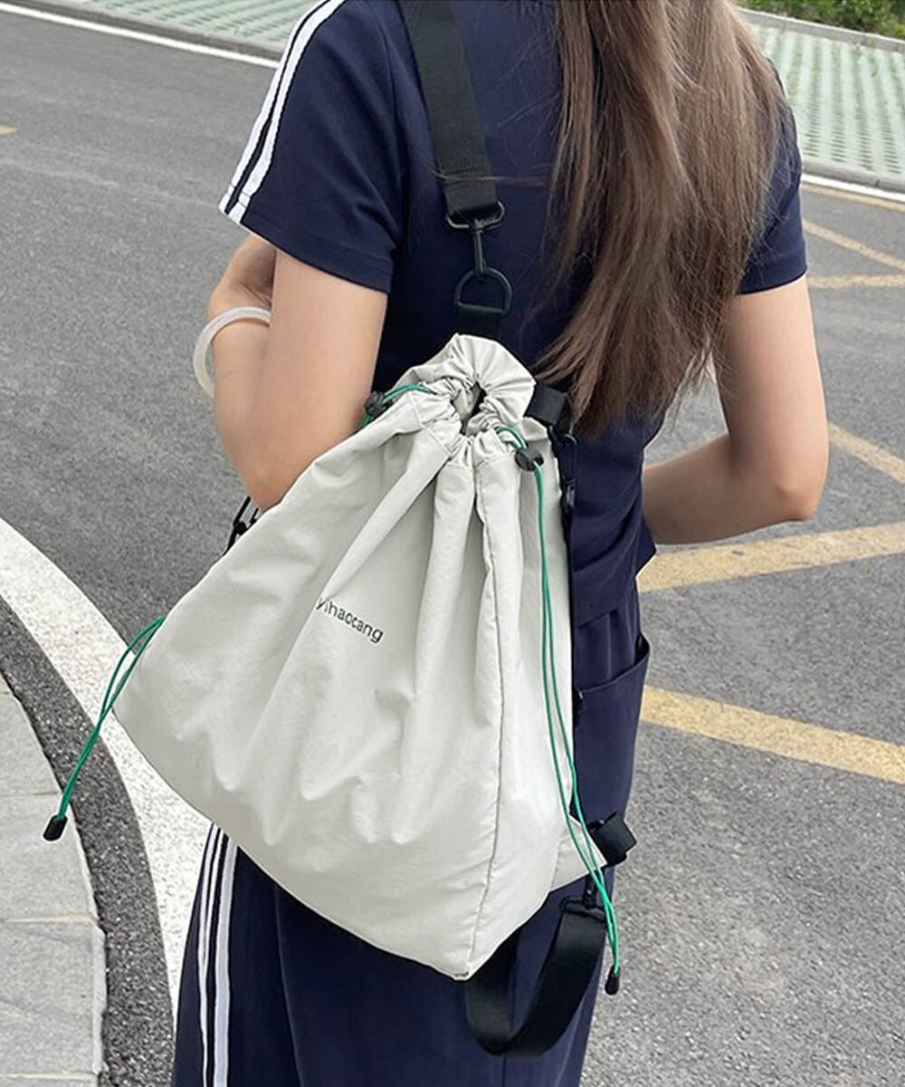 紐を引くだけでキュッと閉じる、コンパクトにまとまる巾着タイプのナップサック。