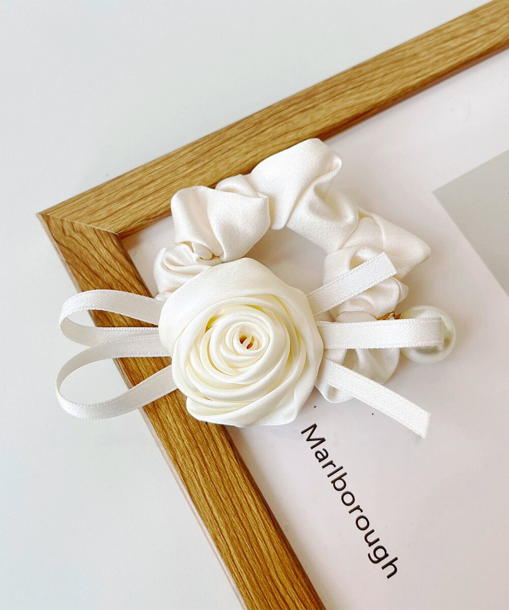 サテン生地で作られたローズモチーフのヘアシュシュ。