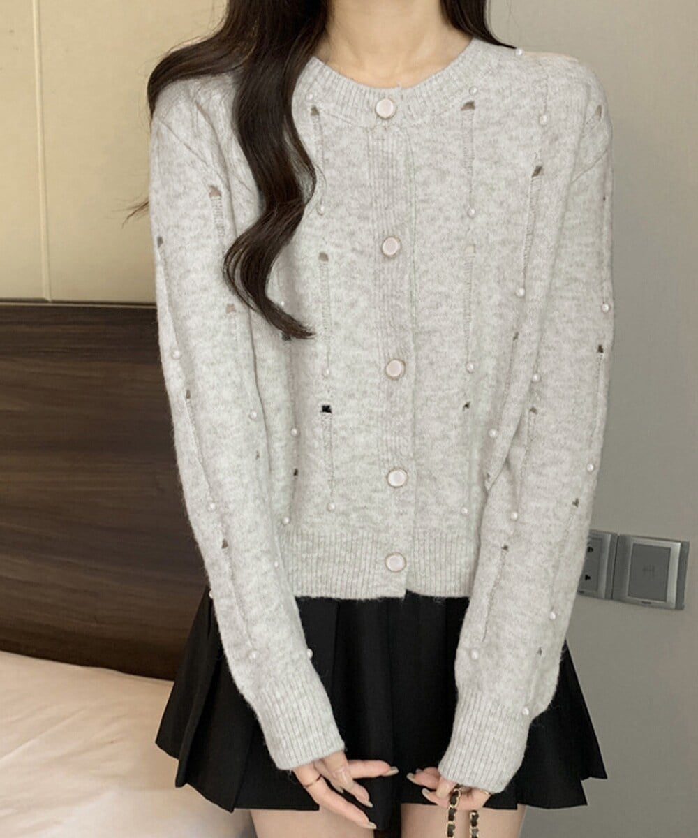 パール装飾がアクセントになったダメージ風ニットカーディガン。