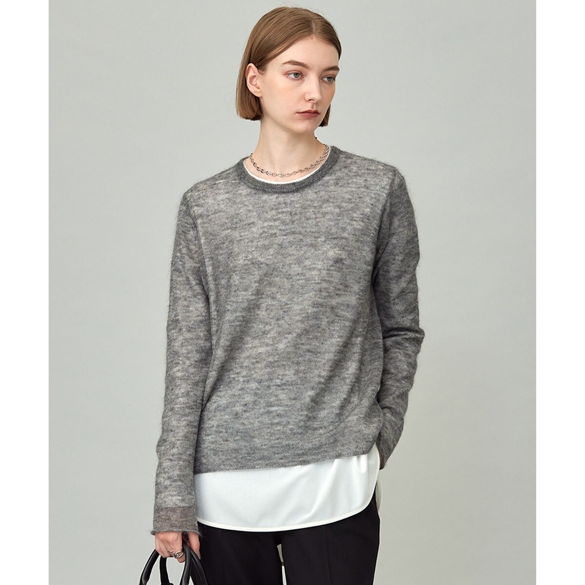 ■デザイン最高級素材を使用した極上のシアーモヘヤニットです。素材の良さを存分に感じられるようシアーに編立て、シンプルでミニマムに仕立てました。女性らしい緩さのあるネックラインと長めのスリーブがリラックス感ある印象です。エレガントで気品溢れるモヘヤニットは、シンプルなボトムと合わせてもコーディネートの洗練度を高めてくれる一枚です。