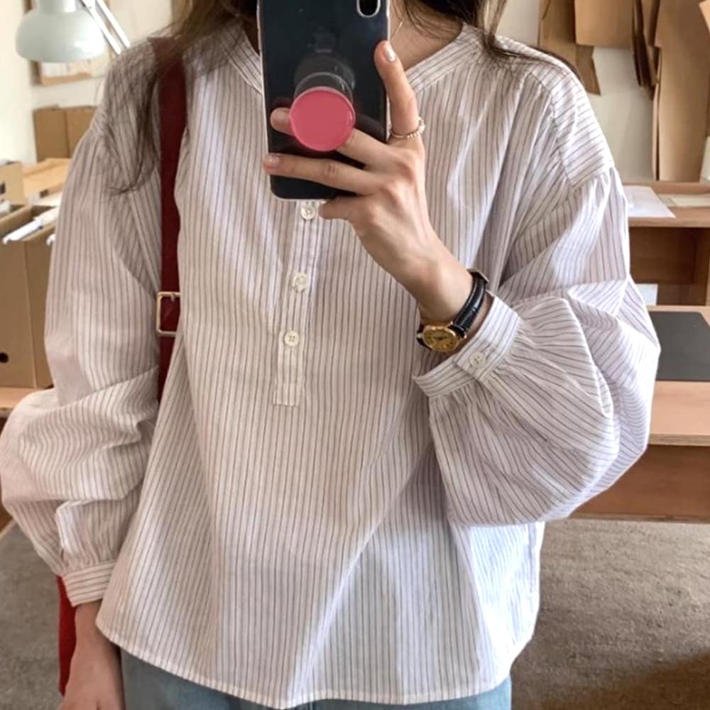 シャツ ブラウス レディース プルオーバー トップス カットソー ストライプ 長袖 スタンドカラー ノーカラー 春夏 30代 40代