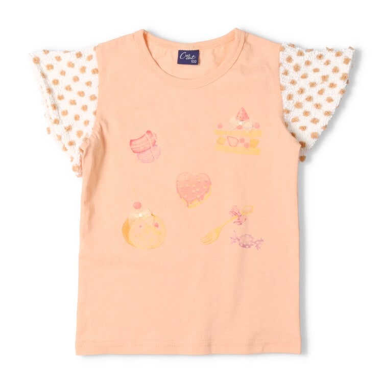 ラベンダーにはパフェ、ピンクにはアイス、オレンジにはスイーツをプリントした半袖Tシャツ。袖部分はドット模様のジャガード素材。小さなリボンのモチーフ付。(ベビーサイズのみ肩ボタン仕様になります。)【アイテム】トップス シンプル ガーリー フェミニン カジュアル お洒落 オシャレ かわいい 可愛い 普段着 デイリーウェア お出かけ着 お外着 お外遊び着 子ども こども 女児 女の子 ガールズ キッズ ベビーサイズ トドラーサイズ 幼稚園 保育園 小学校 通園 通学 小学生 2025年春夏物新作 丸高衣料 薄紫色 お菓子 アイス ハート ケーキ マカロン キャンディ あめ クレセント りぼん