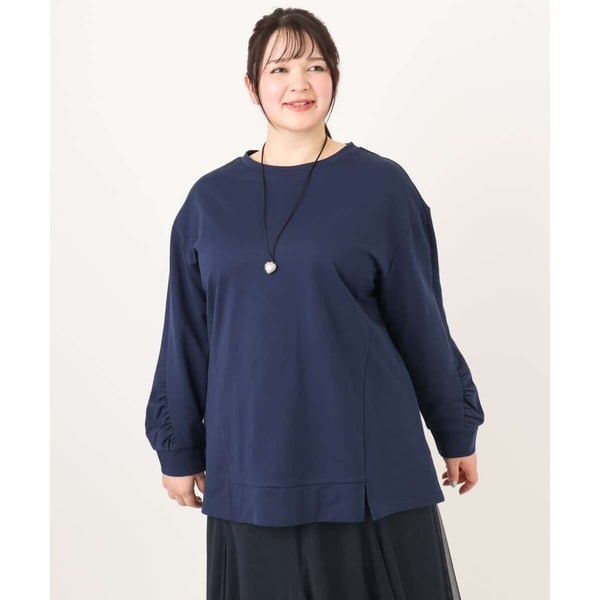 カジュアルになりがちな裏毛プルオーバーですが袖のギャザーが女性らしさをプラスします。