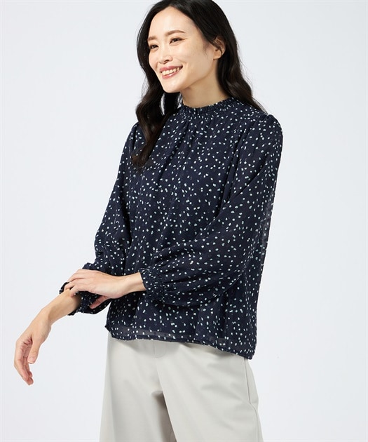 ランダム感のあるドット柄をデザインしたブラウス。凹凸やラメ感も加わっており、華やかな表情に仕上がっています。ネックと袖口のギャザーが女性らしさを引き上げるポイント。ジャケットのインナーにもおすすめです。