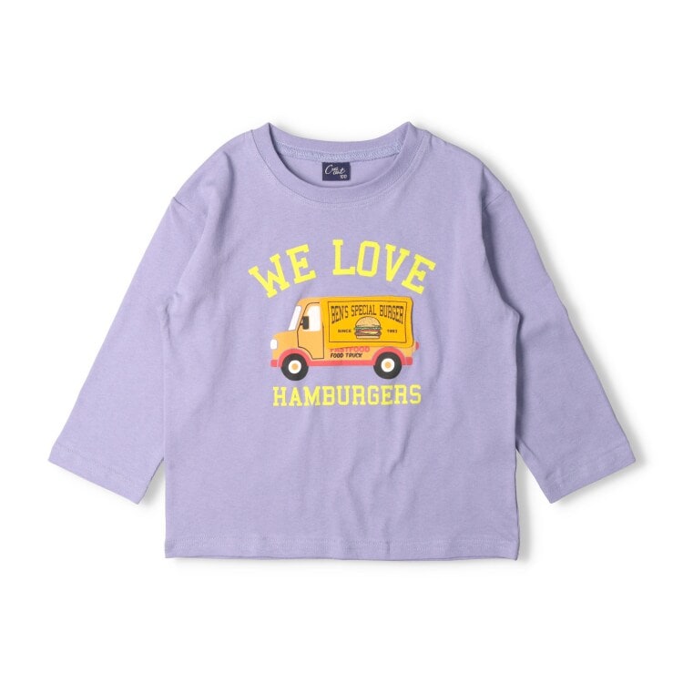 フードトラックのフラップ部分をめくると開店中のお店の様子に早変わり。仕掛けが楽しい長袖Tシャツ、ロンT。(ベビーサイズのみ肩ボタン仕様になります。)【アイテム】トップス カジュアル お洒落 オシャレ かっこいい かわいい 可愛い 普段着 デイリーウェア お出かけ着 お外着 お外遊び着 子ども服 こども服 男児 男の子 ボーイズ キッズ ベビーサイズ トドラーサイズ 幼稚園 保育園 小学校 通園 通学 小学生 2025年春夏物新作 丸高衣料 ロングスリーブ 長袖 ラベンダー パープル 薄紫色 アイボリー オフホワイト 白色 クレセント カー 車