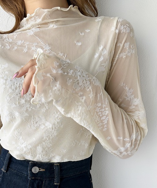 トップス ポリエステル素材 / 花柄 / プリント柄 / 透かし編み / 長袖 / パフスリーブ / LL・13号以上あり / S・7号以下あり / 大きいサイズあり / 洗える / ハイネック・タートルネック / カジュアル / レギュラー丈(トップス)