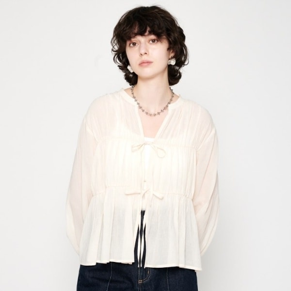 ・フロントにあしらわれたリボンが女性らしさを引き立てるトップス。