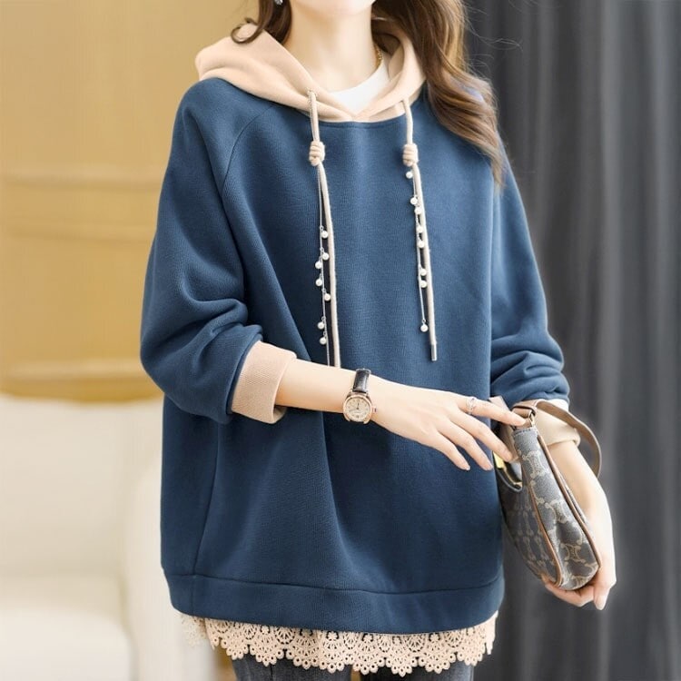 フードの引き紐にパールチャームがついたパーカーの登場です。ゆとりのある絶妙なサイズ感がポイント。裏起毛で暖かく素肌に当たっても心地よいふっくらとした生地です。フード、袖口、裾は配色切替えになっているデザイン性の高いのも◎裾はレースになっているので、腰回りをすっきりと見せてくれます。ルーム使いやデイリーまで使えるカジュアルパーカーはこの季節におすすめです☆