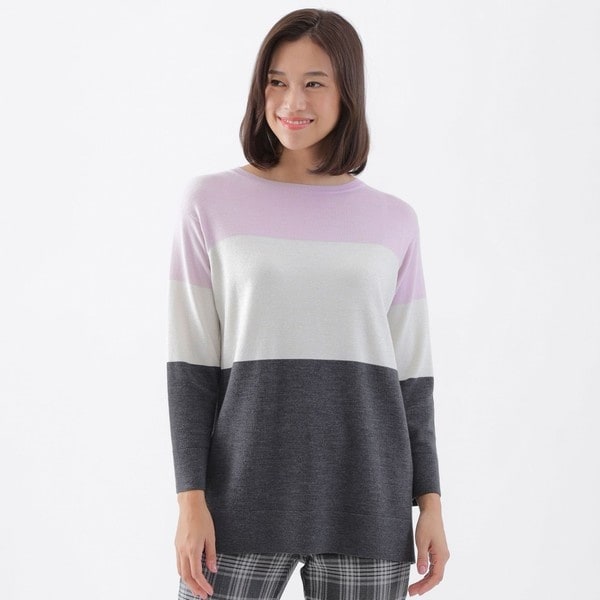 部分的に繊細なラメを編み込んで華やかさをプラスしました。脇は、リブ組織にしてシャープさも兼ね揃えています。着丈は、スカートでもパンツでもいろいろなボトムとコーディネートができる長さにしています。1枚着でさらりと着れる便利なアイテムです。