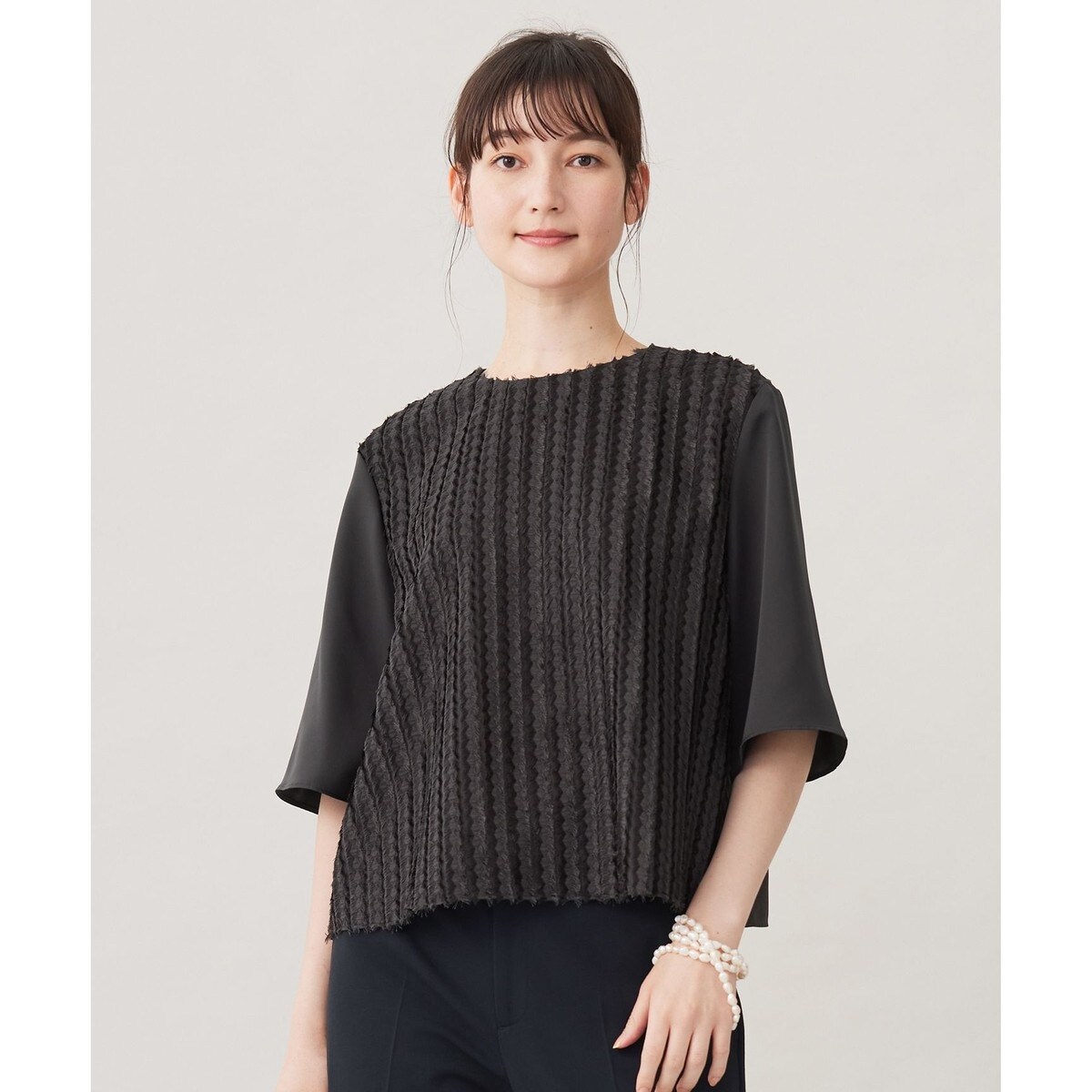 カットジャガードが華やかなブラウス■デザイントレンドのカットジャガードを自由区らしくややシャープな幾何柄で表現したブラウスです。袖と背中部分は別布を使用することで、ジャケットやアウターを着用した際のジャガードの毛乱れやファスナーが糸を噛むなどの心配が少なくなります。また、同素材のスカート(SKW7CW0318)とセットアップで着用した際にIラインが強調され、スタイルアップして見えます。体から程よく離れたシルエットでゆったりと着て頂けます。着丈は短めなのでスカートと合わせやすく、パンツと合わせても今年らしいスタイリングになります。■素材2種類の糸を使用したジャガード素材です。ジグザグの柄は動きがあり、カットした毛先に遊びが出て華やかな印象です。カットした糸の毛先がパサつかないよう糸に何度も撚りをかけ、糸のカット工程は1列ずつ手作業で行われております。糸作りから仕上げまで手間をかけて丁寧に作られた素材です。■同素材アイテムスカート(SKW7CW0318)