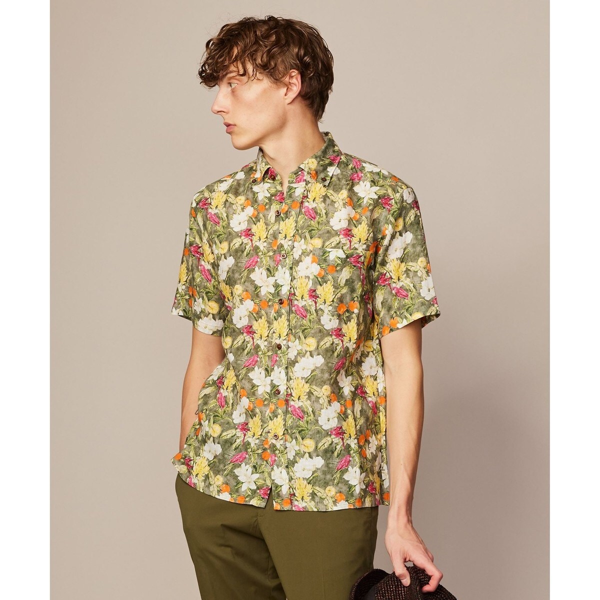 イタリア TEXTA社の生地を採用。愉快でクールなプリントが、イタリアをはじめとしたファッショニスタの胸を射止めたテキスタイル・ブランドです。夏の旅先でのTシャツの羽織りでラフ感を演出しやすくまた、ジャケットのインで使用するとリゾートサイドでのディナータイム時に胸元が映えて夏らしい雰囲気を演出できます。衿デザインはボタンダウンカラーオリジナル淡水貝釦使用