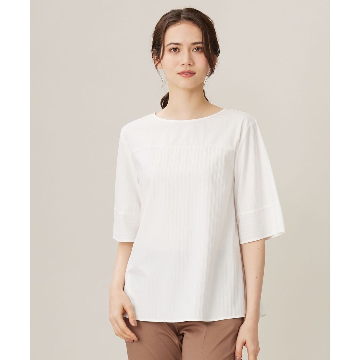 さり気ないストライプ柄が軽やかな印象の5分袖ブラウス■デザインさり気ないシャドーストライプの無地見えブラウスです。ゆったりとしたシルエットと太めの袖が体型をカバーしてくれるデザインです。後ろファスナーのかぶりタイプのブラウスで、デイリーにも通勤にも使いやすい1枚です。ボトムを選ばず、インでもアウトにしも使いやすい長さに仕上げています。■素材自由区定番のシャツ地見えジャージー素材です。毛羽を抑えた超長綿を使用し、ハイゲージでシャツ地に見えるように編み上げました。ジャージー素材ならではの程よいストレッチ性があり、着心地が良さがポイントです。シワになりにくく、ソフトな風合いで肌触りの良いストレスフリーな質感に仕上げました。