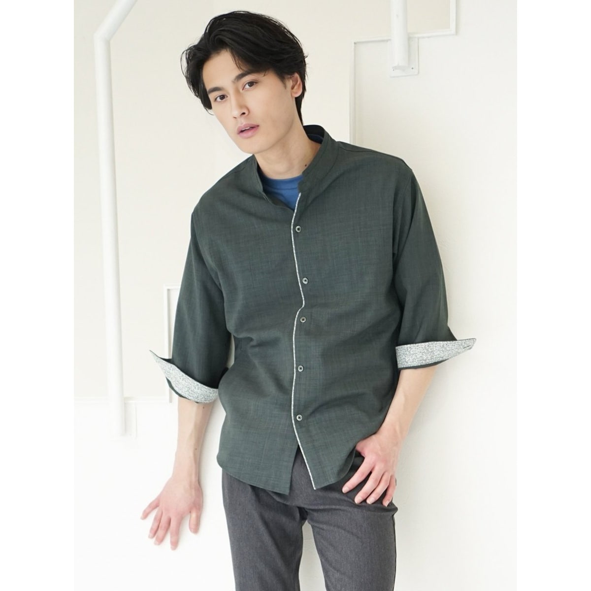 首回りがすっきりとして見えるバンドカラーの長袖シャツです。前立・衿台のボタニカル柄生地でアクセントを効かせています。スラッシュポケット付きで利便性にも優れています。