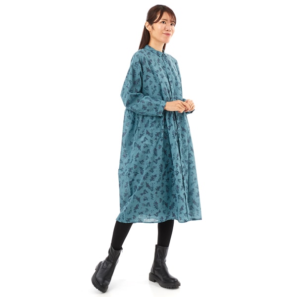 全体に小花柄と落ち着いた色合いをあしらった、秋にぴったりのワンピースになっています。