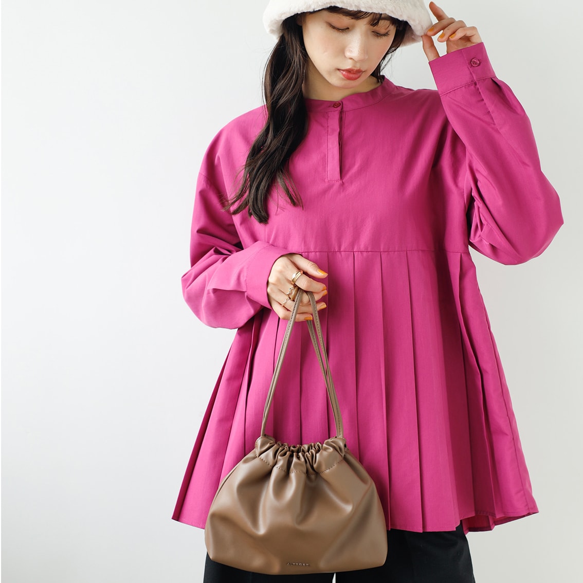 太めのプリーツデザインがフェミニンさを演出し、すっきりバンドカラーデザインと程よくマッチ。