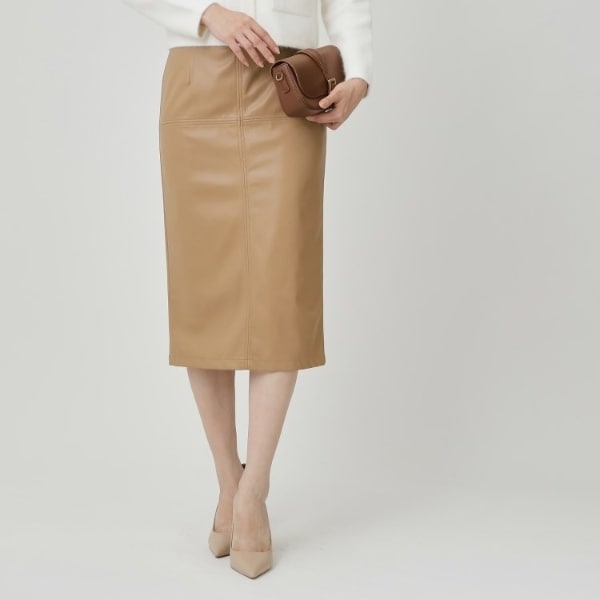しなやかで微光沢が上品見えの合成皮革を使用し、トレンドを意識したミディ丈で仕上げました。