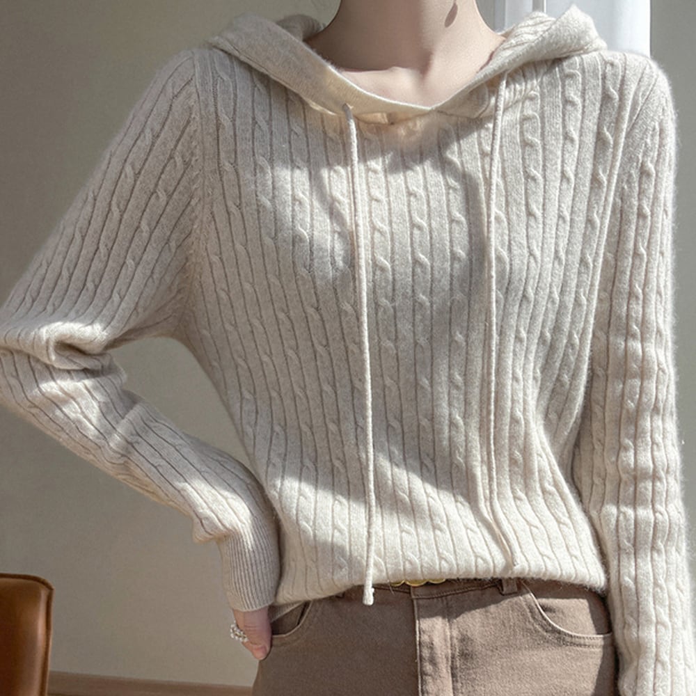 アイボリー ケーブル編み フード付きセーター