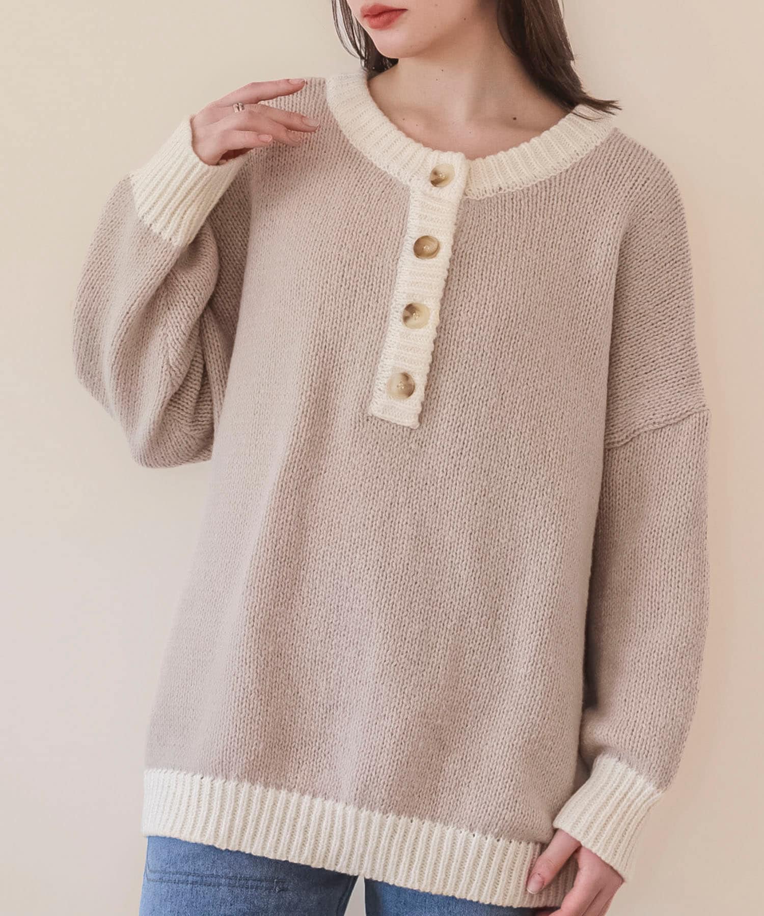 オーバーサイズで冬に着回しやすい前後2wayの配色ニットプルオーバー。