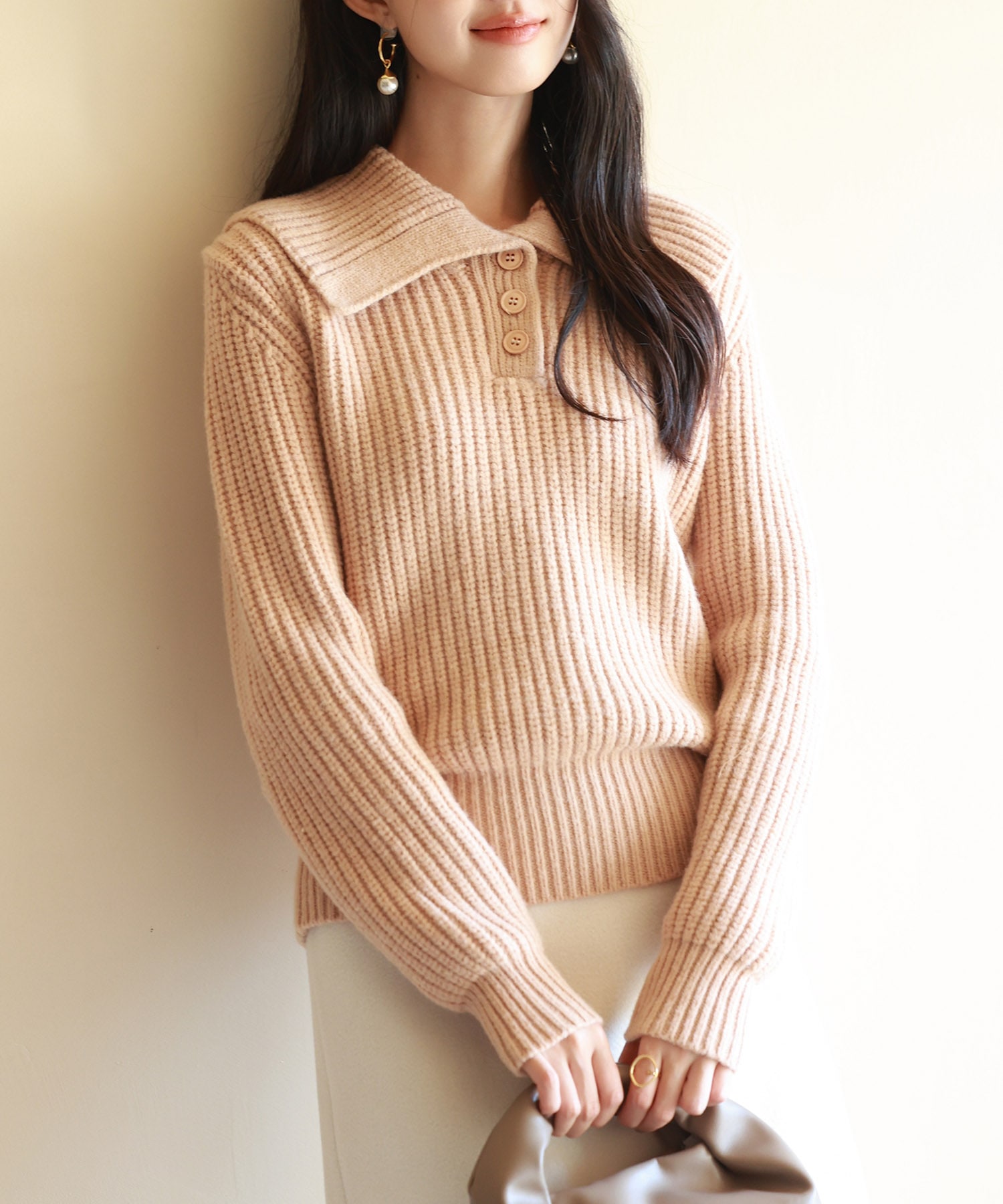ハーフボタンで折り返しができるボリュームたっぷりの襟がアクセント。シンプルなニットながらも華やかさをプラスします。