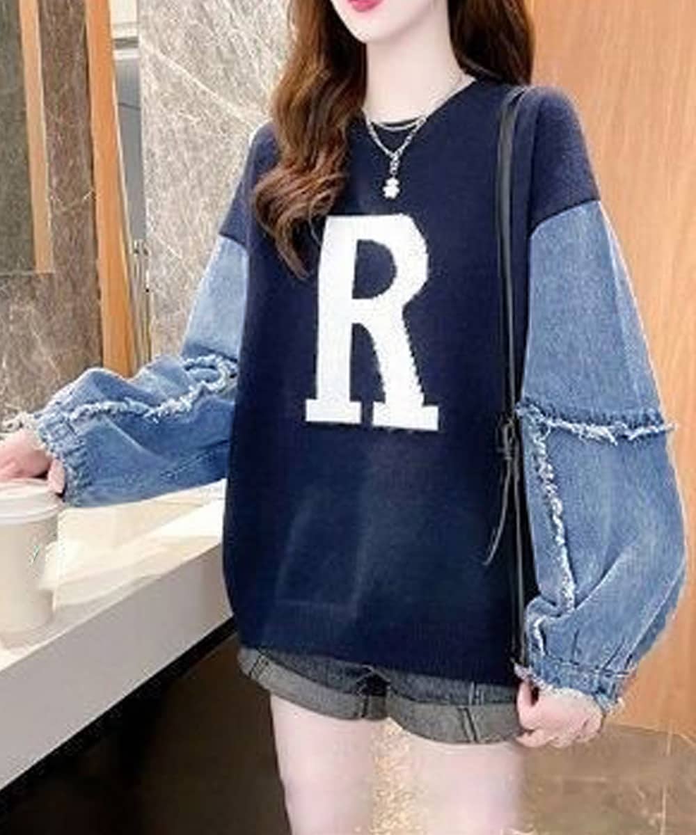 ユーズド加工デニムシャツと英字Logo入りニットトップスをレイヤードしたような重ね着風異素材ミックストップス