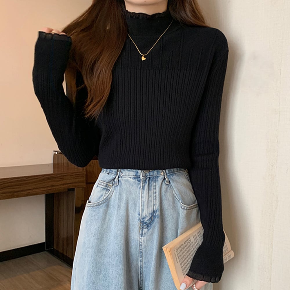 ネックと袖で小さいフリルデザインを施し、洗練された女性らしい印象に