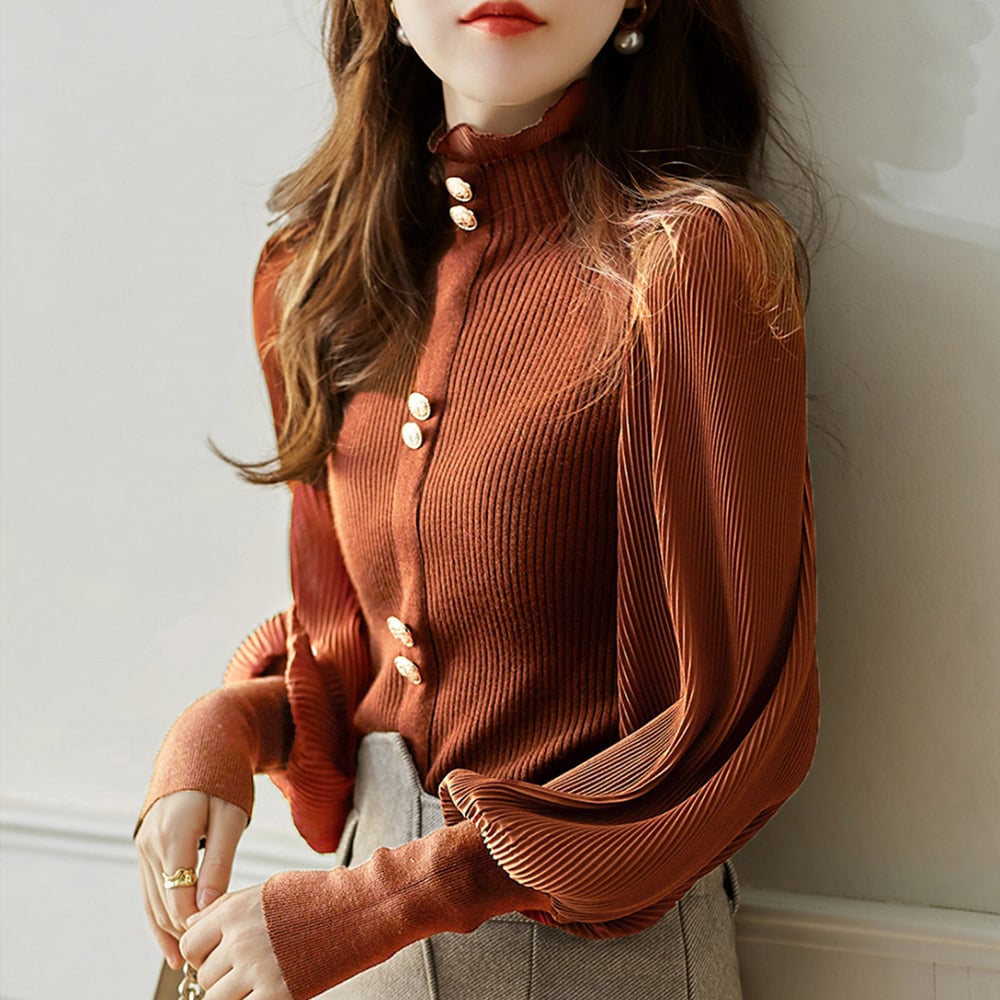 こなれ感が漂うリブニットとプリーツシフォンの異素材ドッキングDesignのフェミニントップス