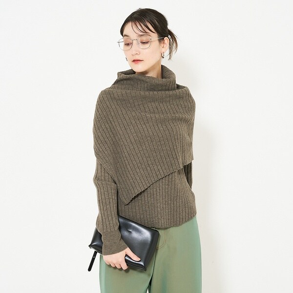 ベーシックなリブニットとアシンメトリーなスヌードをセットにした一着。