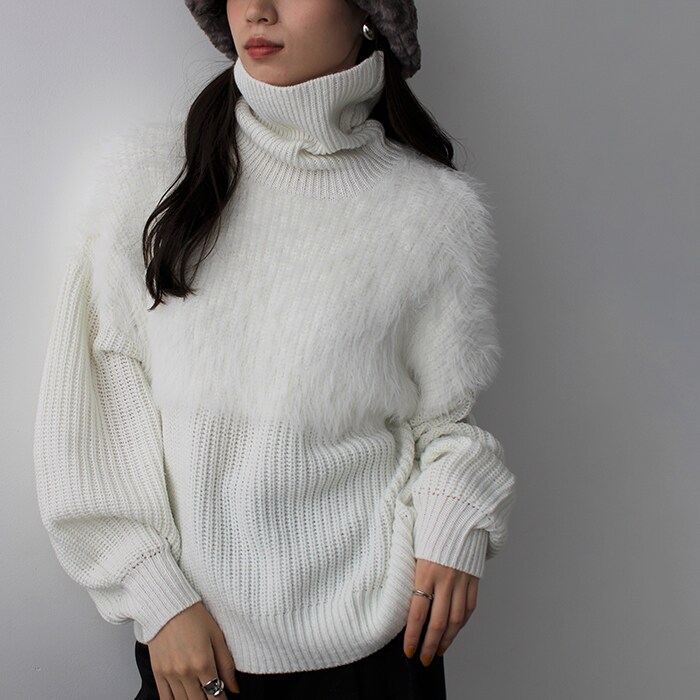 シャギー切替えタートルプルオーバー ニットセーター パープル 紫