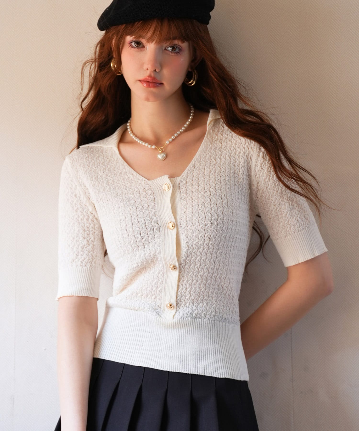 全体に入ったケーブル編みの小さなぽこぽこが立体感のあるトップスを作り、地模様のような柄が一枚でも映えます。