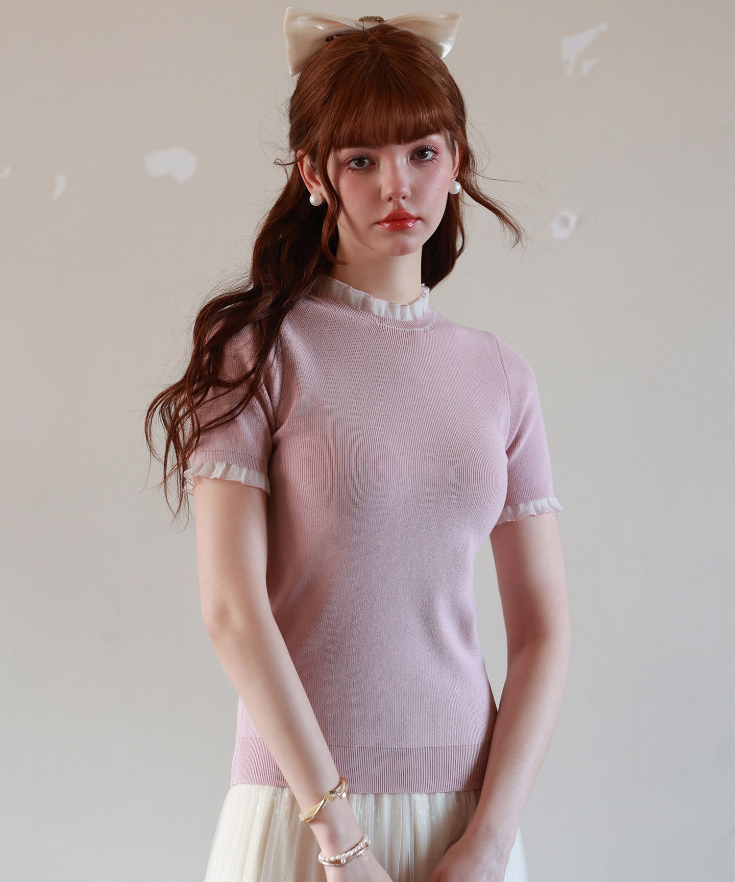 ネックと袖口に小さめのフリルがついて可愛さをプラス。フリル部分はチュール素材でニットとドッキングしているので、こなれた雰囲気になります。ネックレスがなくても華やかな首元を演出します。