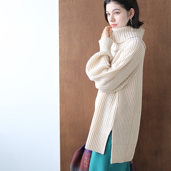 ネックウォーマー付きケーブルニットプルオーバー