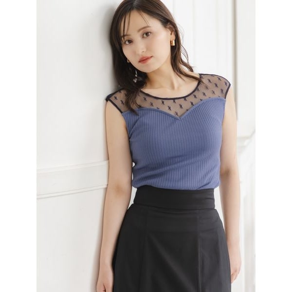 春夏にぴったりなリブ調のカットソー生地に、伸縮性のあるシアー生地をドッキングした、ストレスフリーな着心地のシアー切り替えノースリカットプルオーバーです。デコルテラインに透け感のあるシアー素材を大胆にあしらい、カットソー生地と異素材ミックスさせたデザインは、モードで大人っぽい印象へと導きます。日本メーカーのカットソーとレースを使用しました。程よく身体にフィットするシルエットで、様々なボトムに合わせやすいデザインです。
